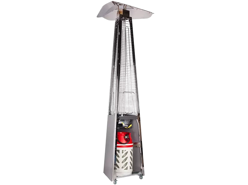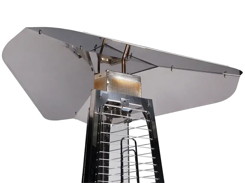 Уличный камин изготовлен из устойчивой к коррозии легированной нержавеющей стали и защищен от попадания атмосферных осадков сверху четырехгранным отражателем, площадь поверхности которого составляет 0,5 м². За безопасность эксплуатации отвечает многоуровневая система защиты. Датчик наклона отключает пламя при наклоне газового обогревателя более чем на 45°, термоэлектрический датчик и электромагнитный клапан сразу же останавливают подачу газа в критических ситуациях, таких как затухание пламени или утечка газа. За счёт встроенной колёсной базы обогреватель свободно и безопасно можно перемещать по любой поверхности.