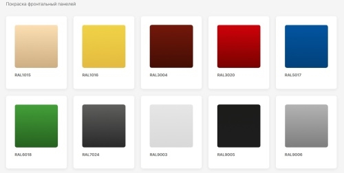 Модель доступна в 10 стандартных цветовых исполнениях фронтальной панели по таблице RAL: 9003, 9006, 9005, 3004, 7024, 1016, 6018, 3020, 5017 и 1015.