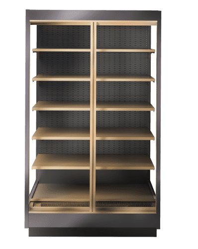 Модель оснащена подставкой с воздухопроводящими решетками, базовой полкой, верхней панелью и задней стенкой с перфорацией и отверстиями для установки кронштейнов навесных полок.