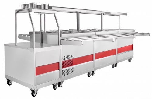 Внизу прилавка для горячих напитков Abat ПГН-70ПМ расположен нейтральный шкаф, в котором можно хранить различный кухонный инвентарь. В комплект поставки входят складывающиеся с двух сторон направляющие для подносов. Прилавок для горячих напитков Abat ПГН-70ПМ оснащен 4 колесиками, 2 из которых являются поворотными со стопорным механизмом.