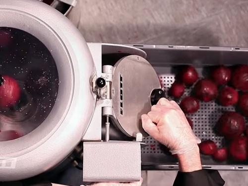После автоматической остановки рабочего цикла открывают выгрузной люк, нажимают кнопку выгрузки и очищенные овощи автоматически выбрасываются.