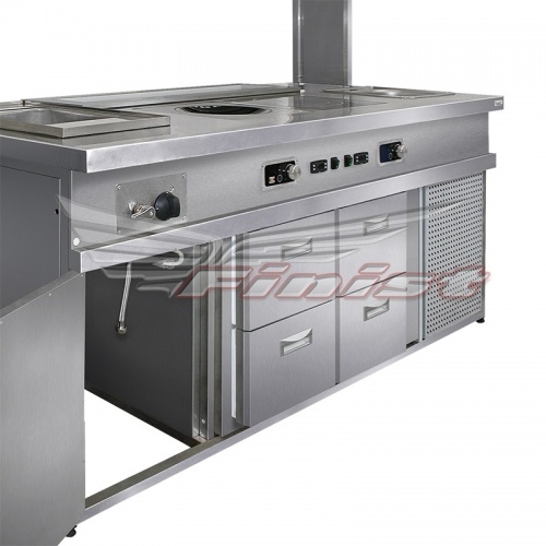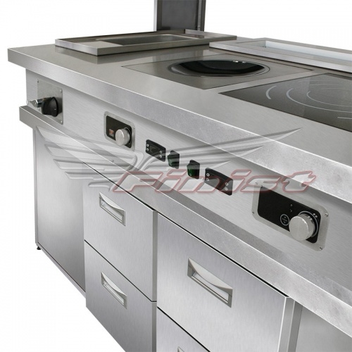 встроенная пастоварка (макароноварка). Благодаря столь компактному расположению, необходимого для приготовления оборудования, повару не придётся совершать лишних движений, и скорость отдачи блюд поразит любого гостя. При необходимости в столешницу можно встроить фритюрницу, при наличии в меню блюд, требующих обжарки на данном оборудовании.
