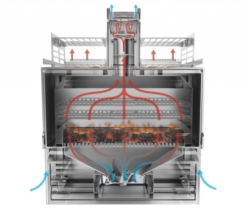 Печь-хоспер изготавливается из жаростойких материалов (внутренняя камера). Внешние панели из нержавеющей стали, дверь цветная (качественное термостойкое керамическое напыление). Печь Josper можно рассматривать как продолжение традиции приготовления продуктов в русской печи. Особенность приготовления – это прежде всего равномерная термообработка со всех сторон (в отличии, например, от гриля-мангала) и неповторимый благородный вкус, который приобретают продукты, приготовленные на древесном угле.