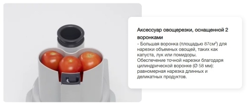 - Экстра-широкая воронка (вмещает до 6 помидоров) для нарезки крупных овощей
