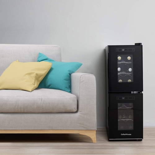 Температура выставляется в каждой камере раздельно, что позволяет хранить одновременно красные и белые вина. Сенсорные кнопки управления температурой и подсветкой, расположены прямо на стеклянной дверце.