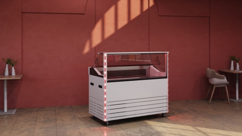 Модель оснащена поворотно-откидной створкой, встроенными ручками и колесами. Cтолешница выполнена из шлифованной нержавеющей стали, передняя панель - из крашеной стали, створка - из плексигласа, корпус покрыт пенополиуретановой теплоизоляцией.