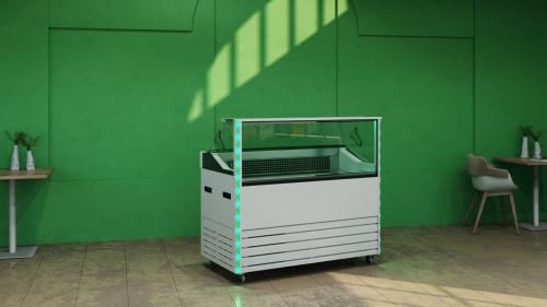 - Технология привлечения внимания покупателей с помощью внешней встроенной LED-подсветки системы RGB по внешним стойкам витрины.