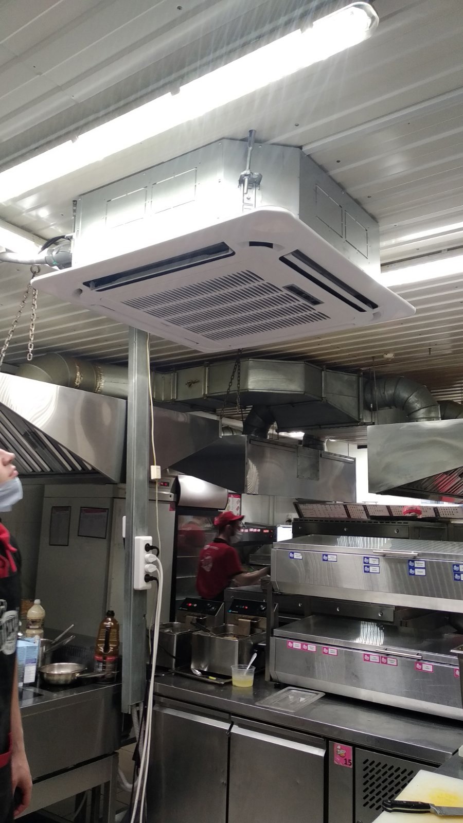 Перед установкой внутреннего блока работники рассчитывают оптимальное расстояние от потолка. Также учитывается, чтобы поток воздуха не был прямо направлен на людей. После расчетов осуществляется установка кондиционера, который крепится на кронштейнах.