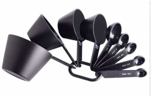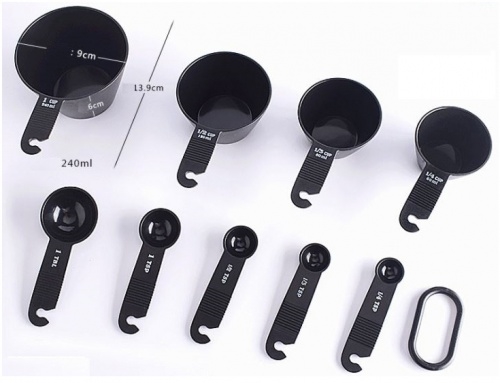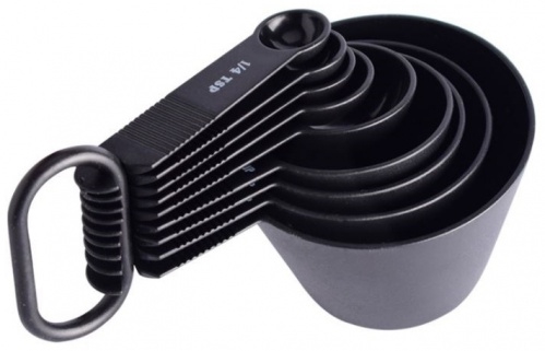Набор подходит для жидкостей и сыпучих продуктов. Выполнен комплект мерной посуды из высококачественного и экологически чистого пластика. На каждой ложке и чашке имеется оттиск количества в миллиметрах. У всех мерных емкостей, входящих в набор, есть на конце отверстие, позволяющее скреплять их для удобства хранения.